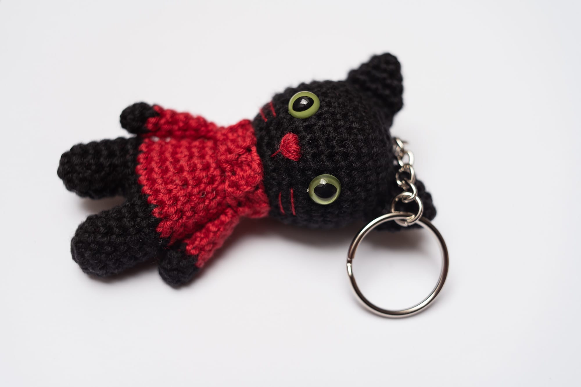 Brelok został stworzony z myślą o miłośnikach kotów i unikalnych przedmiotów. Wyraziste, zielone oczy typu safety eyes nadają mu charakteru, a wysokiej jakości mieszanka bawełny i akrylu sprawia, że jest trwały i miły w dotyku. Dzięki kompaktowej wysokości (ok. 9 cm) jest praktyczny w codziennym użytkowaniu.