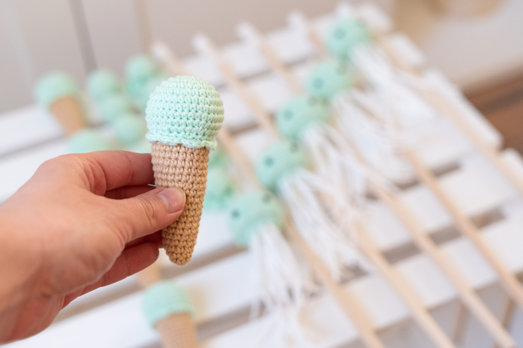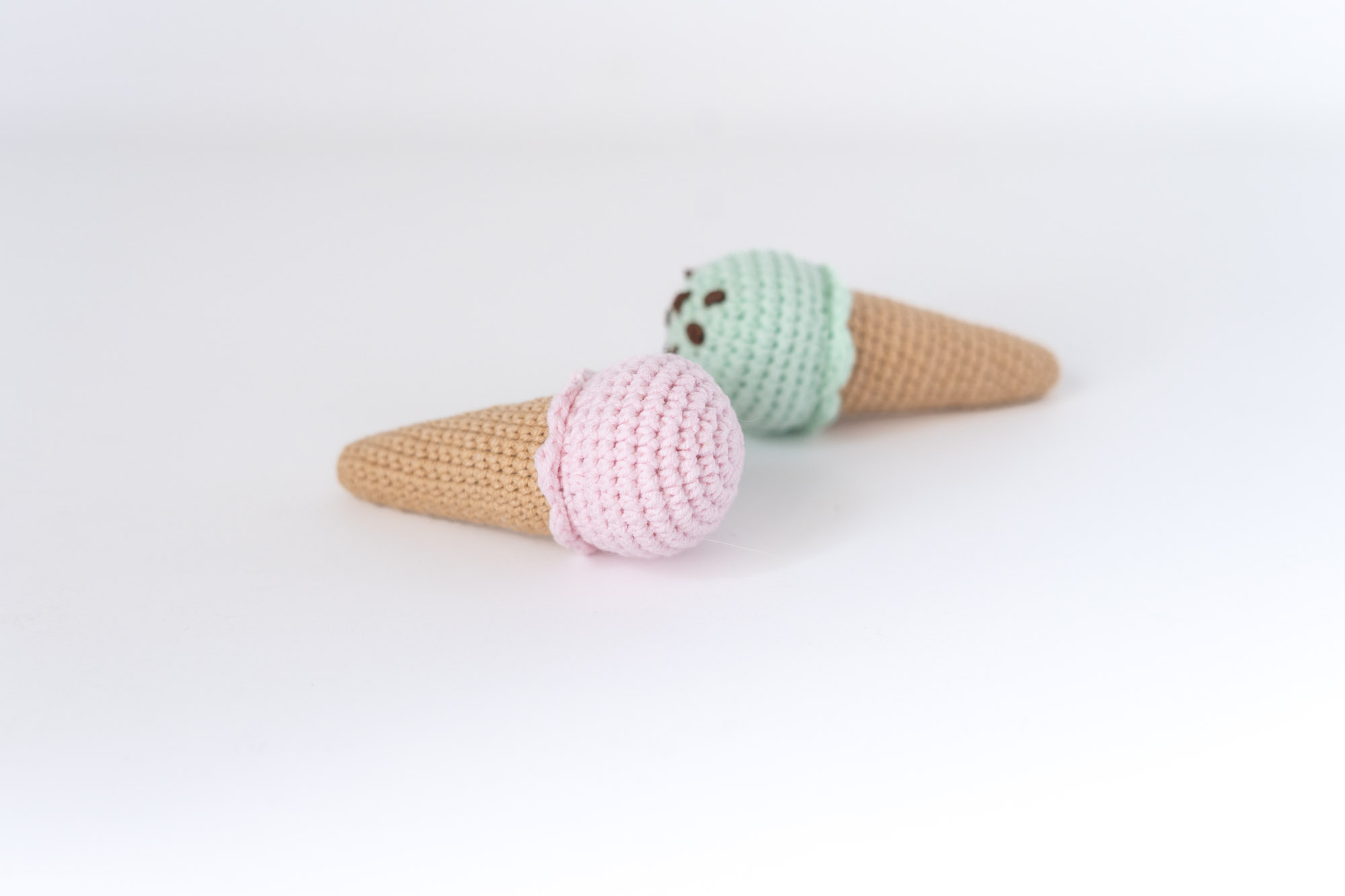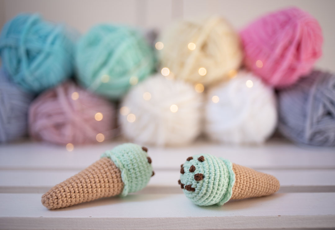 Kocimiętkowo-walerianowe lody wykonane z włóczki o składzie: 55% bawełna, 45% poliakryl.