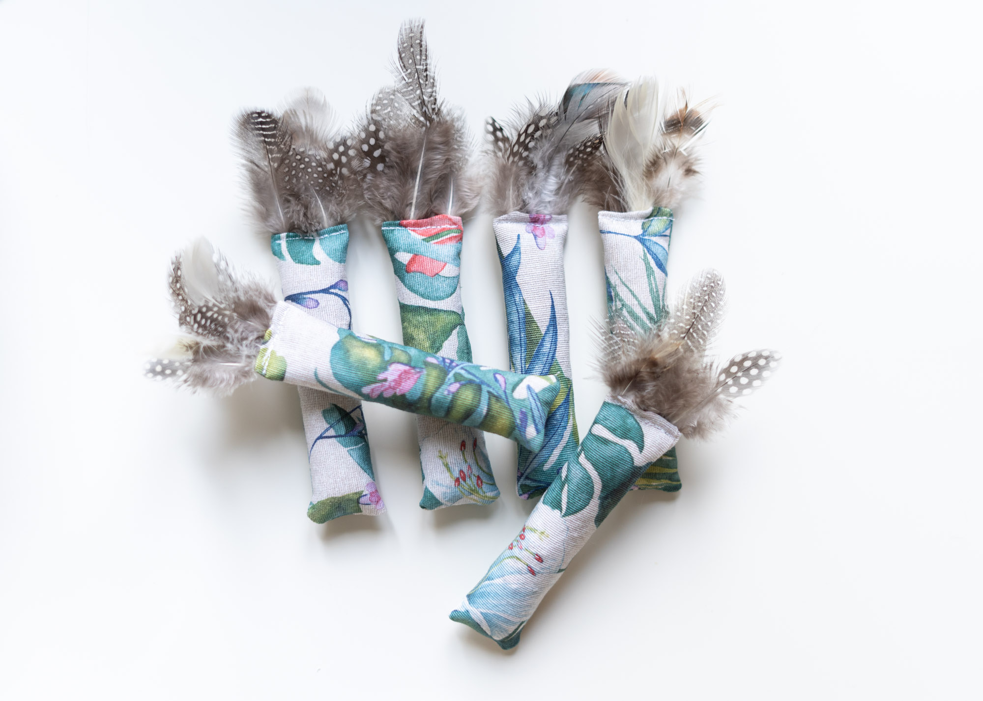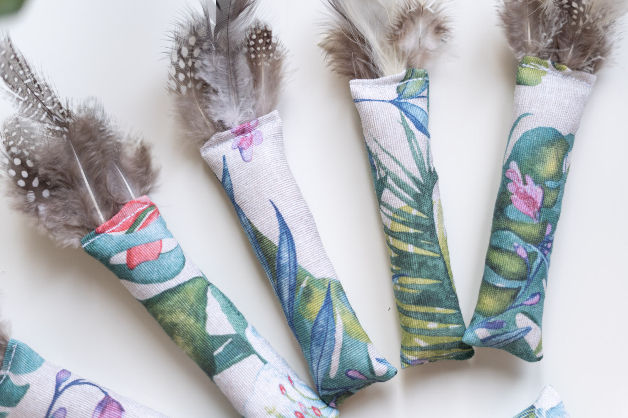 Kopacz dla kota z piórami w egzotycznym motywie dżungli to zabawka stworzona w duchu szacunku do materiałów. Uszyłam go z wysokiej jakości hiszpańskiej bawełny, którą odzyskałam dzięki współpracy less waste z zaprzyjaźnioną firmą. Każda sztuka jest unikatowa – tak jak ułożenie roślinnego wzoru oraz naturalne ubarwienie polskich piór, które wieńczą tę „ofiarę”. W środku znajdziesz moją sprawdzoną mieszankę kocimiętki i waleriany.