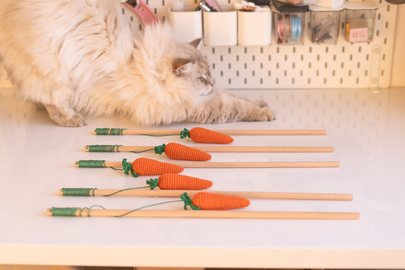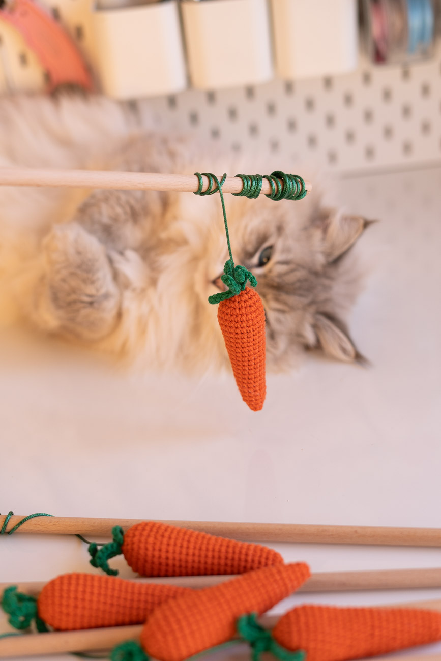 Marchewa ma długość około 11-13cm. Zawieszona jest na dłuuugim, regulowanym sznurku, który przyczepiony jest do dłuuugiego drewnianego kijka (48cm). Marzysz, by z kotem bawić się siedząc jednocześnie na kanapie? Ta wędka jest dla Ciebie (no i dla kota ;-))